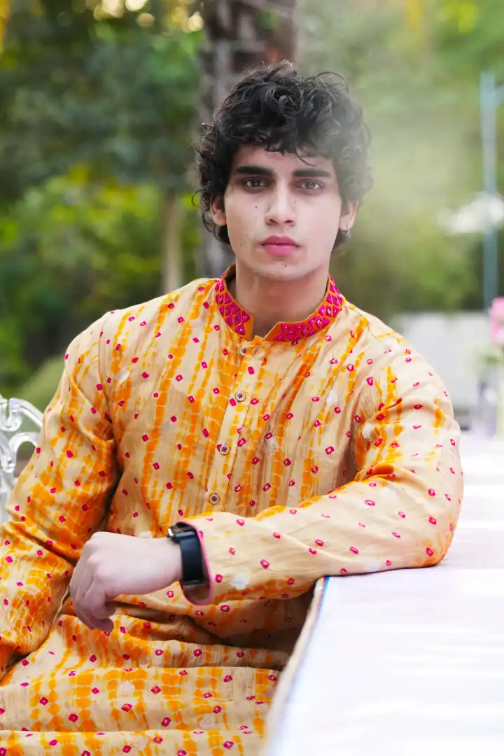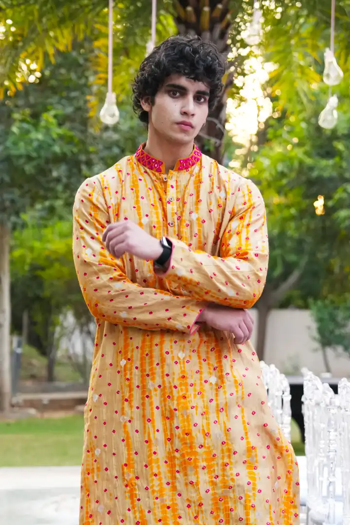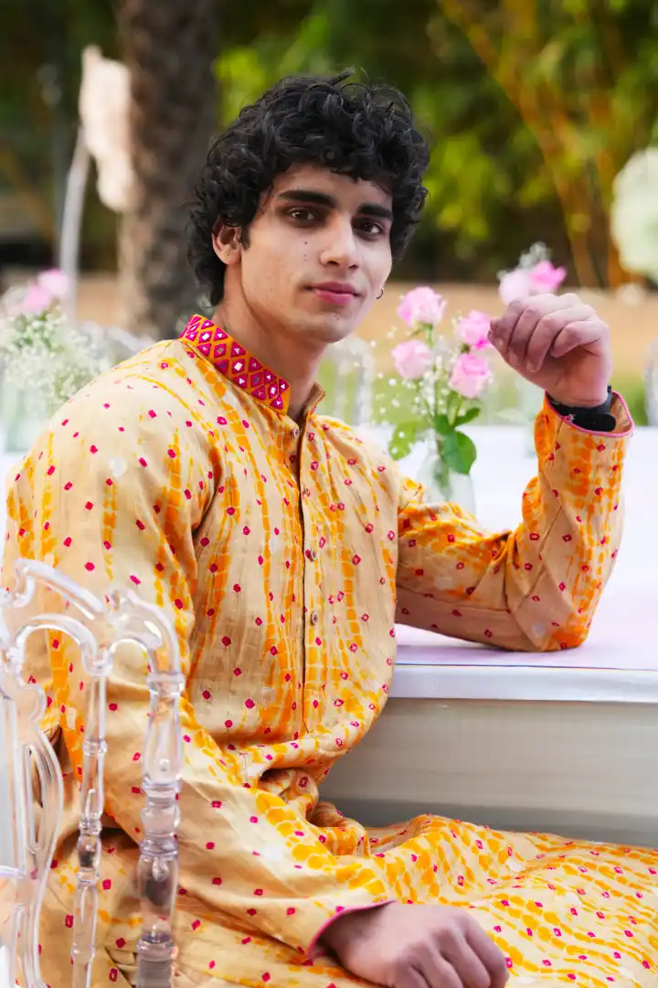 A vibrant yellow bandhej silk kurta accentuated with a mirror work collar, blending traditional craftsmanship with a festive spirit. Lightweight yet regal, this kurta radiates warmth and elegance, making it a timeless addition to any celebration.