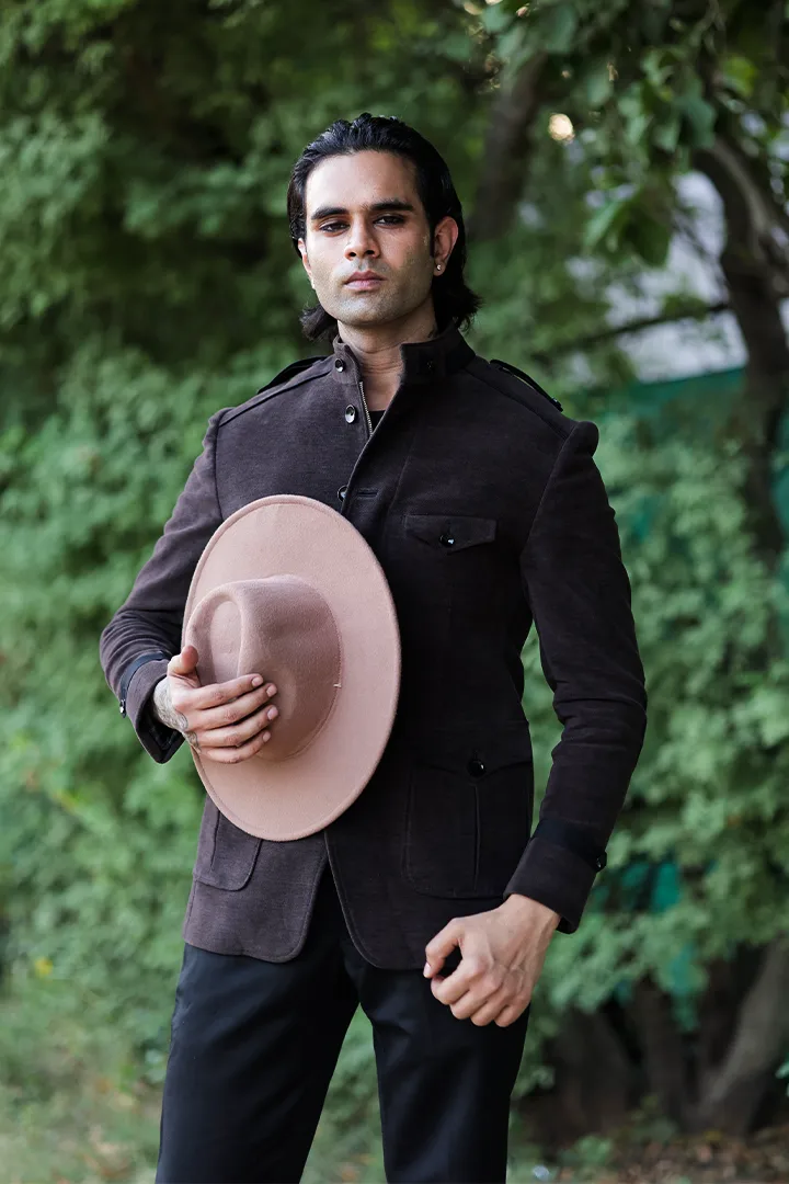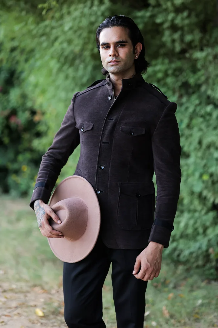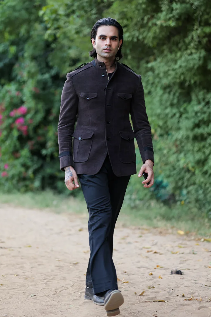 The Hunting Jodhpuri blends the strength of heritage tailoring with a modern sensibility. Designed in luxurious moleskin cotton, it features a zip-and-button front closure, four-pocket styling, and structured shoulders reminiscent of traditional hunting jackets. The deep black tone adds a sharp, commanding appeal — perfect for the discerning modern man.