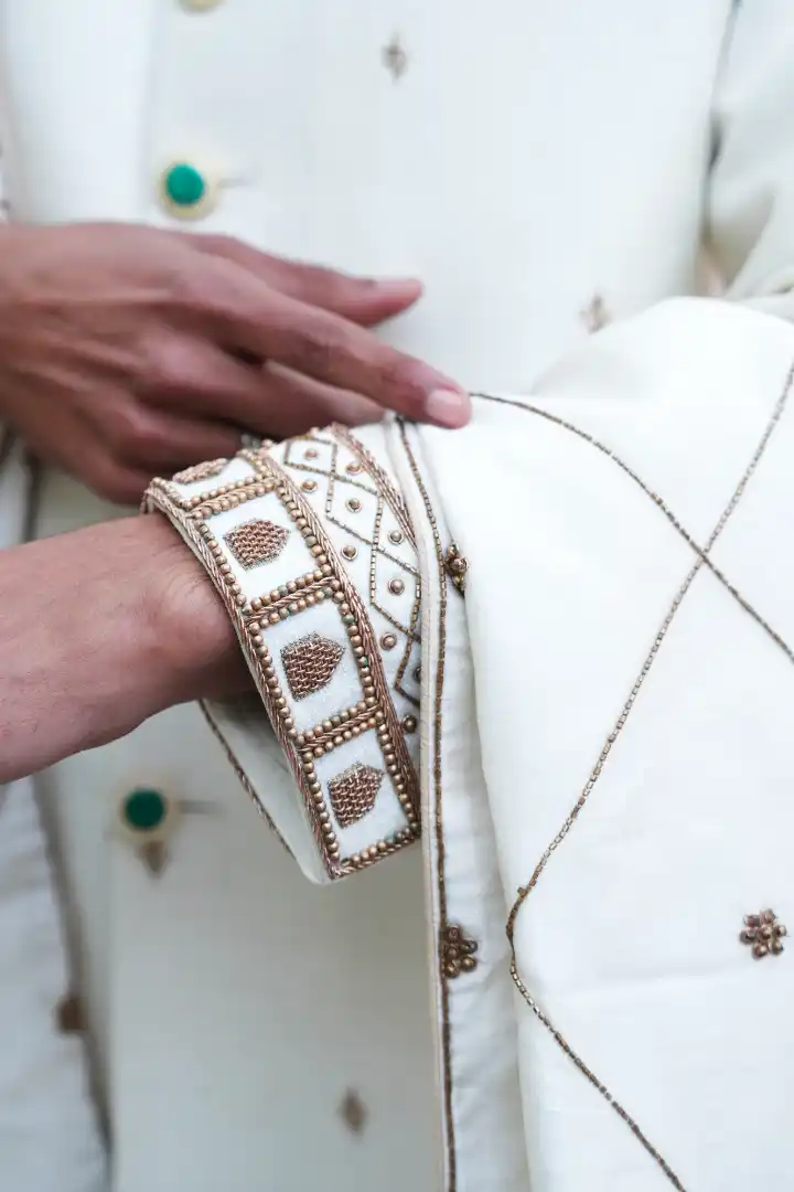 An embodiment of grandeur and craftsmanship, this ivory sherwani is intricately hand-embroidered with zardozi work inspired by timeless wedding motifs. Crafted in luxurious tusar matka silk, it comes paired with a coordinating kurta and churidar. The ensemble can be elevated with a handworked designer dupatta and a regal kamarbandh for a complete ceremonial look.